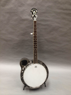 This banjo gets is sound from a traditional mylar banjo head stretched over a 1/2" x 1 1/4" steel tone ring. The tone ring is welded, not bolted to the resonator flange which is integrated into the all steel sound pot. The solid construction eliminates the rattle often found in metal or bolted instruments.
